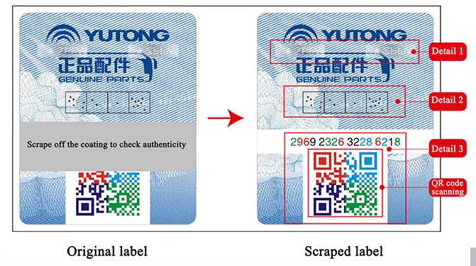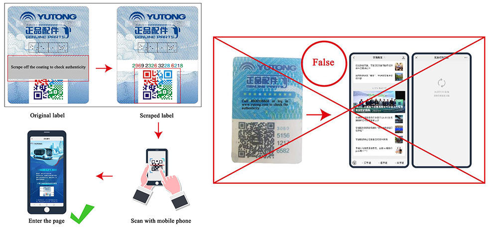 For coolant, AdBlue, air filter, diesel engine filter, clutch, wiper, lamp and adjusting arm,Yutong has provided them with new version of anti-counterfeiting labels and material cards since May 20, 2023. For products of other categories, the labels and cards will be gradually switched. You are welcome to actively report and safeguard your rights and interests.